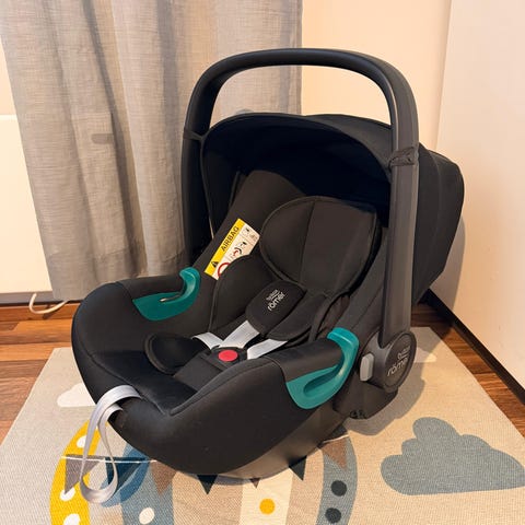 Kokomusta Britax Römerin turvakaukalo, suunniteltu enintään 13 kg painoisille lapselle. Britax on tutkitusti turvallinen valinta lapsen kuljettamiseen autossa.