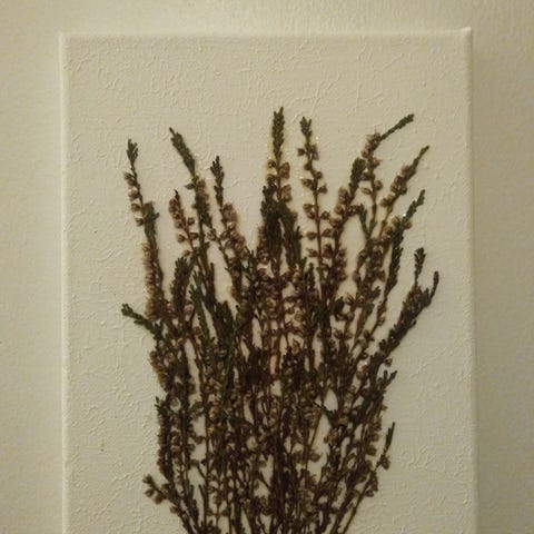 Viime syksynä tehty akryylimaali, glitter ja kuivatut koivunlehdet ja aidot kanervat, jotka päällystetty. Koko 18 x 24cm. Tarjoa jotain