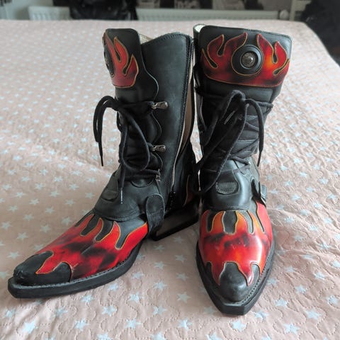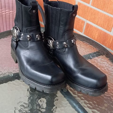 New Rock kävelykengät M.NEWMILI03-S1. Mustat nahkakengät, 3-reikäinen nauhoitus edessä. Pohjat luonnonkumia. Korko 4 cm, pohja 2 cm. Alkuperäinen laatikko on mukana.