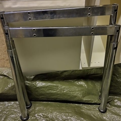 4 kromijalkaa pöytälevylle. Pyöreät kromijalat 4kpl+ruuvit. Halkaisija 6cm ja pituus 68cm (+pöytälevyn paksuus). (Ovh 20Eur/kpl=80Eur). Huom. Mäntyinen pöytälevy ei mukana, vain jalat.