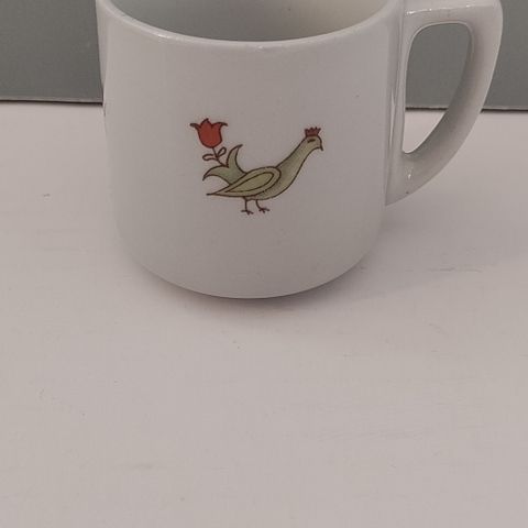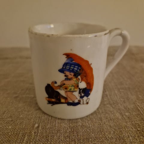 Arabia Lasten muki Ihana vanha pieni lasten käyttöön suunniteltu muki, jossa on lapsi aiheinen kuvitus. Mukin reunasta on pieni pala pois. Reunus on maalattu punaisella.