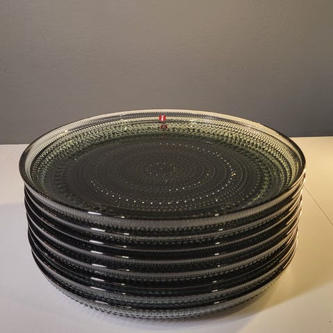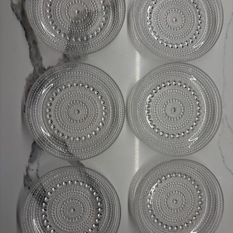 Iittala Kastehelmi lasiset lautaset, sininen väri. Sarja sisältää kolme lautasta, joissa on koristeellinen helmimäinen kuviointi. Lautasen halkaisija 14cm. Kaikki yhteensä 20€.