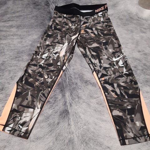 Nike Pro juoksutrikoot naisille, koko M. Trikoot ovat moniväriset ja valmistettu joustavasta materiaalista, joka soveltuu juoksuun ja muuhun urheilukäyttöön. Vyötäröllä musta joustava vyötärönauha, jossa Nike Pro -logo.