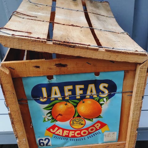 Vanha puinen Pardess Jaffa-appelsiinikori kuvien mukaisessa kunnossa. Ilmeisesti 1900-luvun puolivälistä. Säilytetty kuivassa sisävarastossa; pinnoissa jossain kohti hieman pölyä/likaa. Ulkomitat (noin): korkeus 31,5cm, leveys 31cm, pituus 48cm.