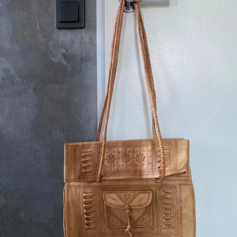Myydään konjakinruskea vintage olkalaukku. En ole aivan varma onko pinnoitettua nahkaa vai tekonahkaa. Hihnan kulumaa lukuun ottamatta (ks kuvista) siisti kunto.