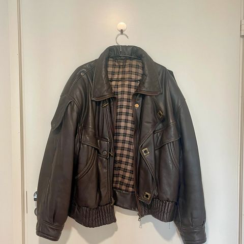 Kuvan perusteella takin vuori on tikattu, mikä on tyypillistä nahkatakeille.