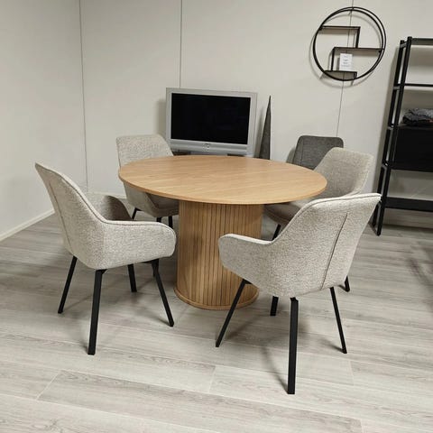Pyöreä Ø120 cm pöytä tarjoaa mukavasti tilaa neljälle hengelle, ja sen puuviilupinta tekee jokaisesta tuotteesta uniikin puunkuvioinnin vaihdellessa yksilöllisesti. MDF-runko takaa kestävyyden ja kauniisti levenevä jalkaosa tuo modernia tyyliä tilaan.