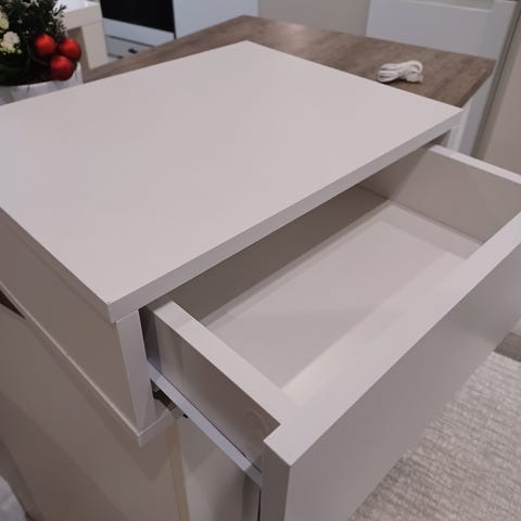 Pieni valkoiseksi maalattu lipasto. Kannessa puukuvioutu d-c-fix.