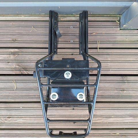 Skyteam mankin takateline sisältäen kromatun metallirungon ja mustan muovisen rekisterikilven pidikkeen.