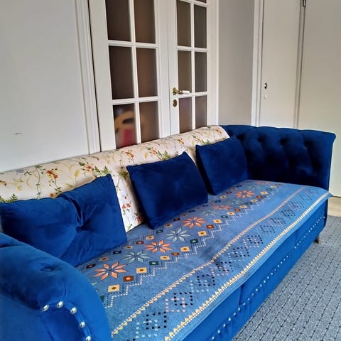 Verhoilu on ylellistä, pehmeää samettia, joka antaa sisustukselle raikkaan väripriimun — valittavana tummanvihreä, keltainen, sininen ja beige. Sohva on suunniteltu kodin mukavuuteen: istuintyyny tarrakiinnittyy runkoon, joten tyynyt pysyvät siististi paikallaan, ja toimitukseen sisältyy selkätyynyjen lisäksi kaksi irtotyynyä. Halutessasi voit täydentää ilmettä eri värisillä Lido-tyynyillä.