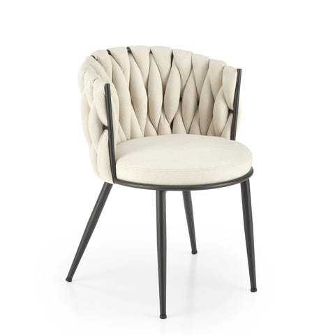 Olivia tuolin selkänoja on kauniisti paksupunottua kangasta, mikä luo eleganttia ilmettä ja tarjoaa mukavuutta ruokailuhetkiin.