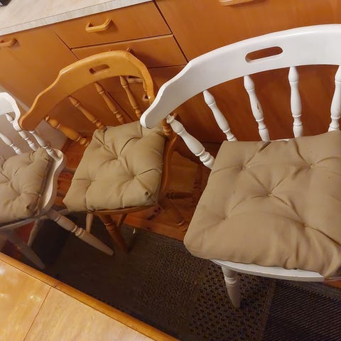 Tuoleissa on selkeitä kulumisen merkkejä, kuten naarmuja ja pintakulumaa. Puu on paikoin haalistunut ja istuimissa on näkyvää kulumaa. Yleisilme on kuitenkin edelleen vankka ja käyttökelpoinen.