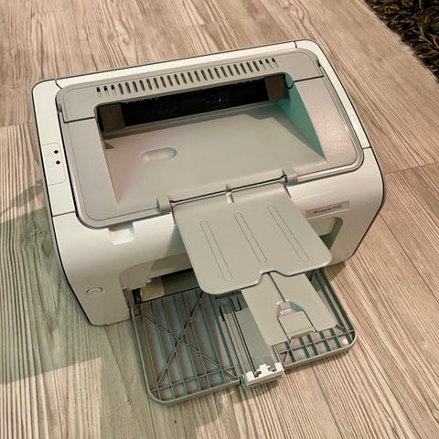 HP LaserJet managed E 40040 mustavalkolasertulostin. Laite tukee mustaa värikasettia ja on tarkoitettu toimistokäyttöön. Näytössä näkyy tulostuskasettien tila ja tulostettujen sivujen määrä.