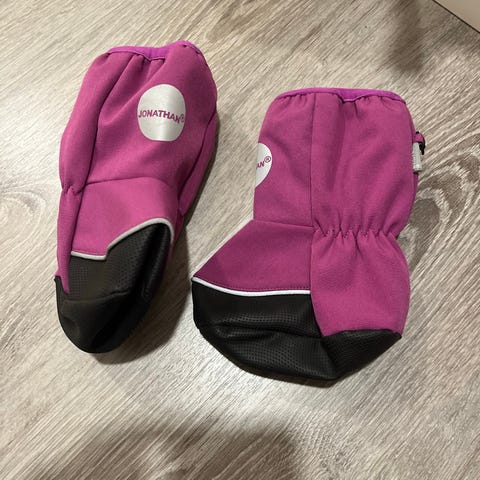 Erittäin hyväkuntoiset, lämpimät pikku töppöset. Pintamateriaali pehmeää mokkanahkajäljitelmää, sisällä pörröinen vuori. Ei kokomerkintää, pohjan ulkomitta 15,5 cm.