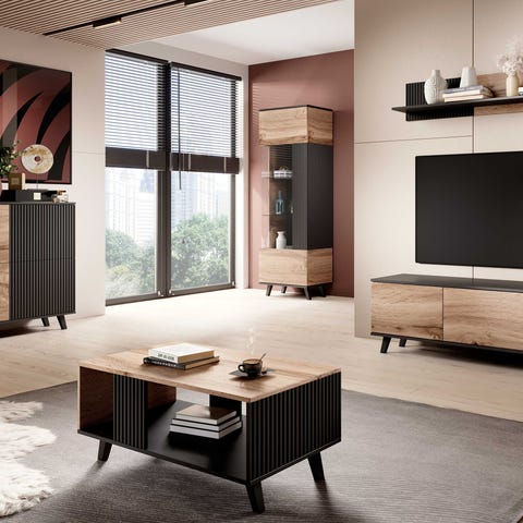 Rafal TV-tason on elegantti yhdistelmä wotan tammea ja mustaa joka luo tyylikkään ja modernin ilmeen tilaan yhdistäen erilaiset sisustustyylit saumattomasti.