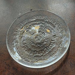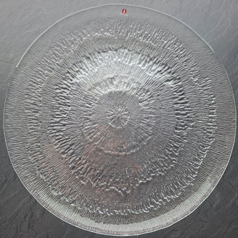 Tapio Wirkkalan Iittalalle vuonna 1974 suunnittelema lasinen Solaris-tarjoilulautanen. Halkaisija 36cm. Täysin ehjä.