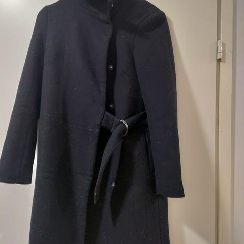 Kaunis tummanharmaa hupullinen villakangastakki. Koko 32. Käytetty vain muutamia kertoja, hyväkuntoinen.