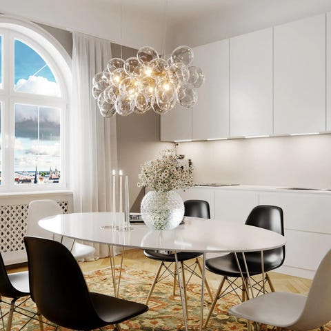 Gross Bar, 38 lasikuulasta koostuva riippuvalaisin, joka hurmaa tyylikkyydellään ja ylellisyydellään. Tämä upea valaisin ei ainoastaan tarjoa kauniita valonheijastuksia, vaan se toimii myös takuuvarmana katseenvangitsijana, muuttaen huoneesi täysin uudeksi ja näyttävämmäksi.