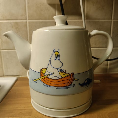 Posliinia oleva Muumi vedenkeitin, käytetty mutta hyvässä kunnossa. Ainoastaan nouto. En lähetä.