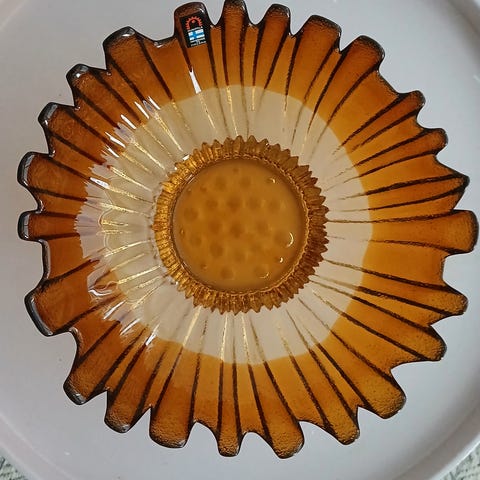 Humppilan tokka lasimalja, halkaisija noin 30 cm, ruskea väri. Malja on valmistettu lasista ja siinä on aaltomainen reuna. Soveltuu koriste- tai käyttömaljaksi.