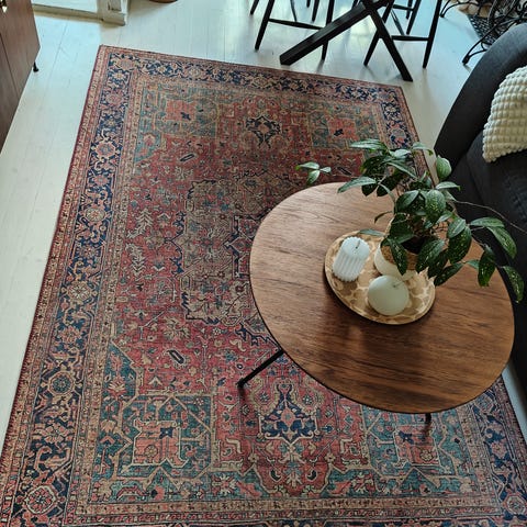 Matossa yhdistyy kauniisti eri sävyt. Matto on heatset käsitelty, joten se ei kerää huonepölyä ja sopii siten allergiaperheisiin.