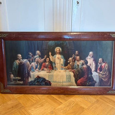Painava taulu jossa kohokuvalla Jeesus ja opetuslapset ja puinen kehys joka sametilla päällystetty. Mitat: 32 x 43 cm
