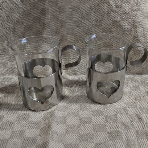 Hackman Joulu -lasimukit, 2 kappaletta. Mukit ovat lasia, ja niissä on teräksiset kahvat, joissa sydänkuviot. Mukit soveltuvat kuumille juomille ja ovat osa Joulu-tuotesarjaa.