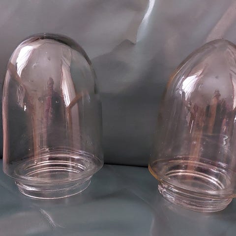 Myynnissä kaksi vintage valaisimen lasikupua, vuodelta 1980.