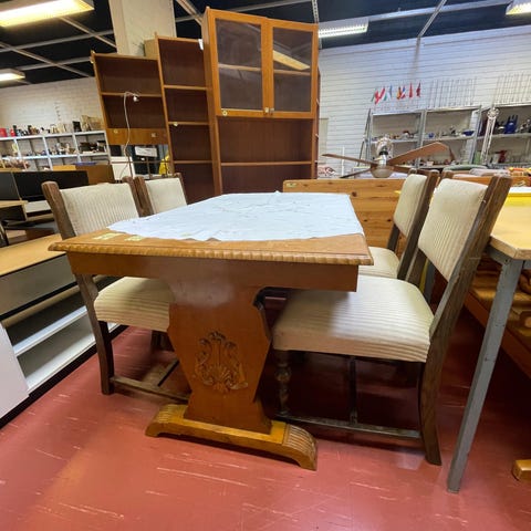 Antiikkinen puinen ruokapöytä ja siihen kuuluvat pehmustetut tuolit. Pöydän pinta on kiiltävä ja pöytälevy on suorakaiteen muotoinen. Tuolien verhoilu on tummanvihreä, ja ne ovat tukevarakenteisia. Huonekalut sopivat ruokailutilaan tai vastaavaan sisustukseen.