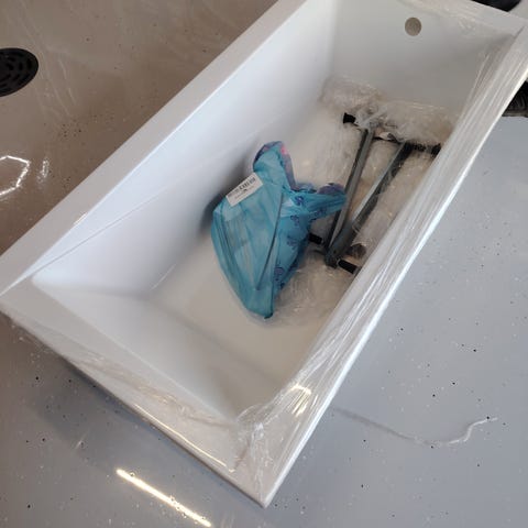 Vapaasti seisova valkoinen kylpyamme, jonka toinen pääty on korkeampi. Materiaali akryyli. Jalkojen koristekuoret ovat irrotettavissa, todennäköisesti myös jalat, tosin en ole niitä koskaan irrottanut. Tulppa vuotaa, joten se on vaihdettava ennen käyttöä.