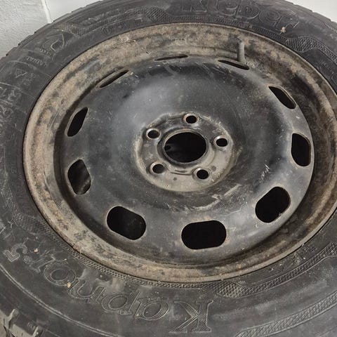 2001 vuoden outbackista ylimääräisenä jääneet vanteet. Päällä vaihtokunnossa olevat kesärenkaat. Ehjät ja pyöreät