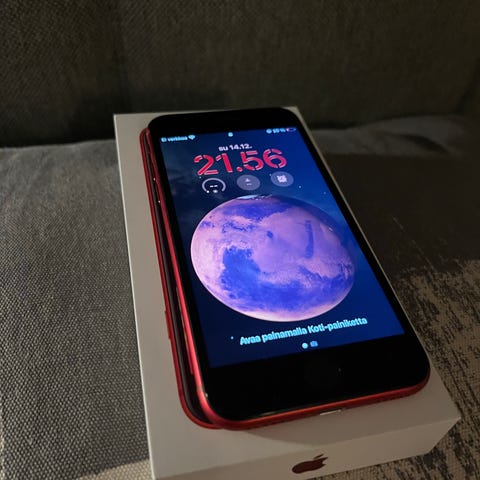 Apple iPhone SE älypuhelin, 64 GB tallennustilalla, punaisella värillä. Puhelimessa on kompakti koko ja yksinkertainen muotoilu, sopiva päivittäiseen käyttöön. Valoa vasten narmuja näytössä, käyttöä ei haitta. Tarvike akku.
