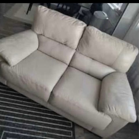 Myydään kuvan mukainen nahka sohva sekä 2 koristetyynyä. hyväkuntoinen. Ei lumen valkoinen vaan sanoisinko että lähes kerman valkoinen.