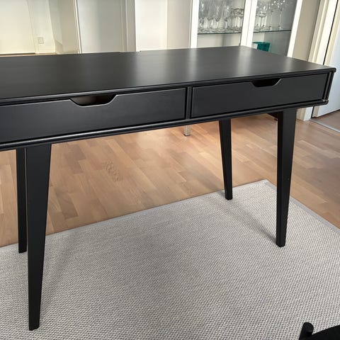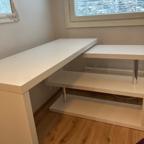 Myydään hyväkuntoinen Muurame työpöytä. Toisella puolella isompi kaappi koivunvärisellä ovella ja toisella puolella hyllykkö lasiseinällä.