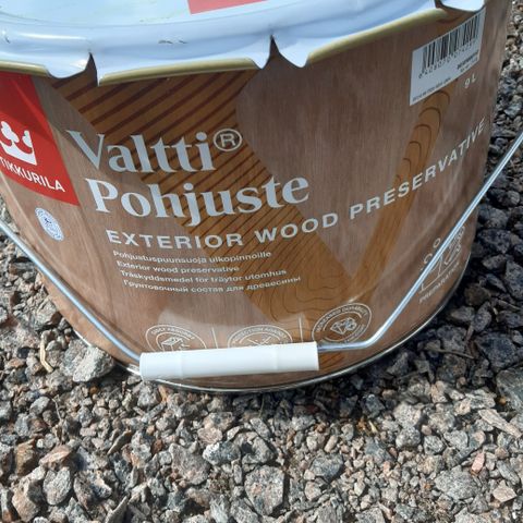 Ylijäämä Valtti Plus Pohjuste 9L talonrakennuksesta. Sopii puun pohjustamiseen ennen kuullotusta/maalausta vähentäen maalin tarvetta ja suojaten paljasta puuta homeelta.