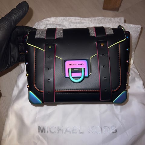 Upea musta Michael Kors Manhattan -laukku holografisilla yksityiskohdilla ja neonreunoilla. Aitoa nahkaa, erittäin hyväkuntoinen ja lähes käyttämätön. Tyylikäs ja harvinainen malli – sopii arkeen tai juhlaan.