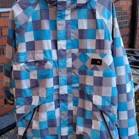Musta-punaruudullinen hupullinen siistikuntoinen laskettelutakki.