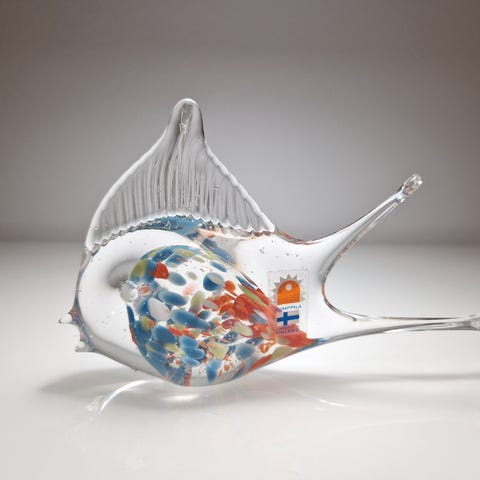 sininen lasinen delfiinipatsas. Tällaisia patsaita valmistetaan usein käsin, ja ne voivat olla peräisin esimerkiksi Muranon saarelta Venetsiasta.