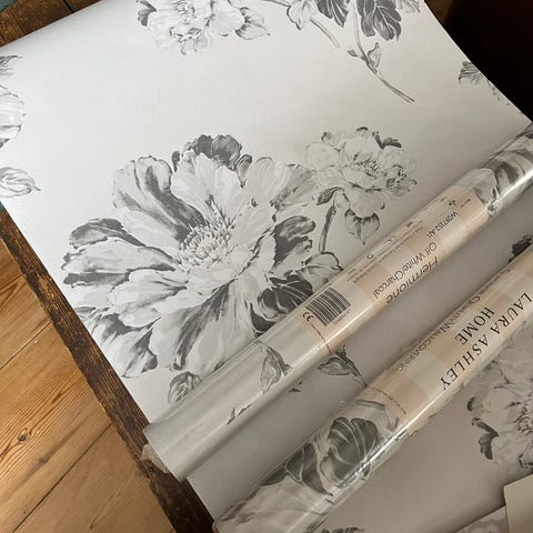 Vanhaa keltaraidallista paperitapettia 8 rullaa. (Yksi avattu kuvausta varten)
