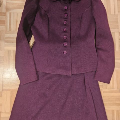 Tämä Jean Claire - jakkupuku on todella chic. Jo vintage- ikään päässyt asukokonaisuus on 100 % villaa. Niin takki kuin hame ovat vuorellisia. Koko merkintä on ranskalainen 40. Takin kainalo - kainalo mitta on 50 cm. Hameen vyötärö mitta on 92 cm. Vastaa EU mitoituksella S/M ( 36 - 40). Asusteiden pohjaväri on tumman vihreä, missä on erivärisiä pilkkuja kuten keltaista, aneliinia, turkoosia, violettia ja mustaa. Ikäänsä nähden se on kunnoltaan hyvä käytetty. Kuuntelen tarjouksia.