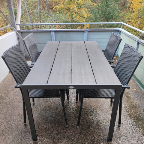 Puutarhapöytä, valkoinen, kansimuovia, metalli runko, aurinko varjovalmius, kannessa halkeama mutta ei haittaa käyttöä.