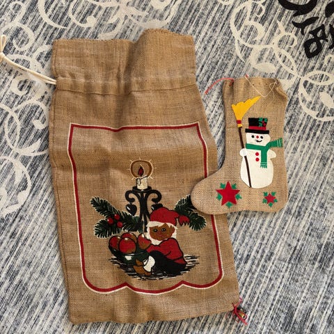 Koriste-esineet: joulupukki, istuu keinutuolissa kaksi lasta sylissään (keinuva) ja joulukuusi. Näillä on jo jonkin verran ikää, mutta edelleen hyväkuntoisia.
