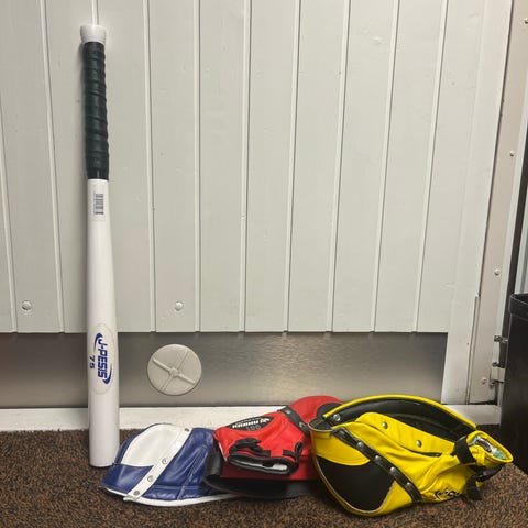 Setissä on puinen pesäpallomaila (pituus 75 cm) ja JR500-räpylä
