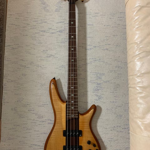 Tikkiin laitettu Ibanez SR924QM 80-luvulta. Tässä on nauhat vedetty leveliin ihan hetki sitten. Kaula on jossain vaiheessa ottanut jonkinlaisen damagen, mutta kitarasepän mukaan paikattu taitavasti, siististi ja on vahvempi kuin ennen. Dingejä siellä täällä, mutta yleisilme siisti.