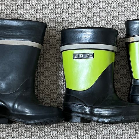 Lasten vuorelliset nokian kumisaappaat. Narut ovat käytössä hapartuneet ja voivat katketa.