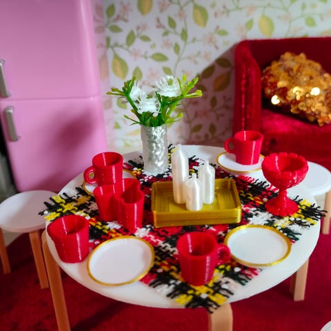 Astiasetti 1:16: 4 valkoista mukia korkeus 9mm, 4*lautaset, valkoinen malja korkeus 15mm, valkoinen maljakko korkeus 8,8mm, 4xtabletti, kynttelikkö, kukkamaljakko. 5e.