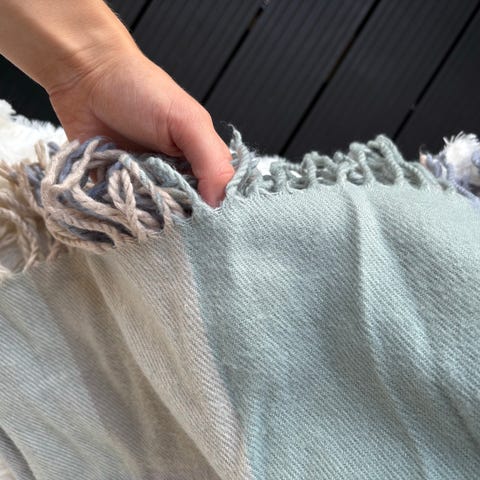 Valkoinen viltti jossa on kirjaimet A, B ja C (näkyy kuvissa). Väri on valkoinen (ehkä enemmän luonnon valkoinen). YlimmänC kirjaimen kohdalla on viimeisen kuvan mukainen läiskä, olen yrittänyt saada pois, mutta ei ole lähtenyt niillä aineilla joita käytin. Nouto Pitäjänmäeltä.
