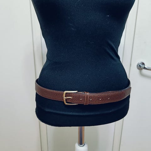 Kuvioitu Nahkavyö kullanväriset soljet koko S. Vyö on muutoin uudenveroisessa kunnossa, mutta molemmilta puolin soljesta puuttuu pieni kukkaornamentti, näkyy kuvissa, huomioitu hinnassa.