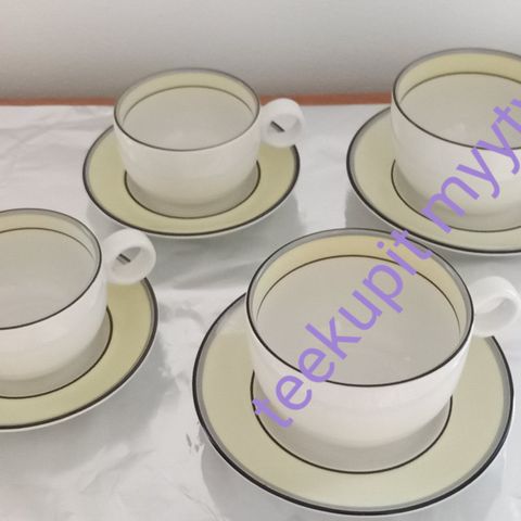 Ostan sarjan isompia teekuppeja (halkaisija 10cm) kupeissa tulee olla asetti mukana ja täysin ehjiä ja hyväkuntoisia.