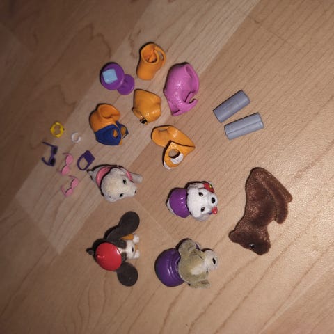 Toisen kuvan puinen lelukoira 0,5 euroa, muovinen lelusetti hahmoineen 0,6 euroa.